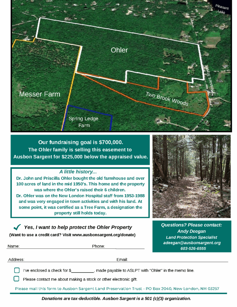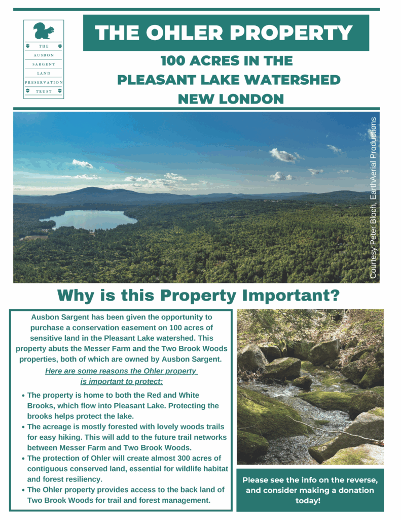 The Ohler family has provided the Land Trust with the opportunity to purchase a conservation easement on 100 acres of sensitive land in the Pleasant Lake watershed. This property abuts the Messer Farm and the Two Brook Woods properties, both of which are owned and protected by Ausbon Sargent. The two-page informational flyer below outlines the reasons why the property is so important to protect.